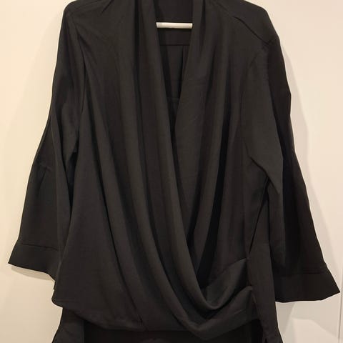 Punainen naisten pusero, koko 46. Puserossa on pitkät hihat, joissa liehuke- tai röyhelöyksityiskohdat. Materiaali ei ole määritelty.