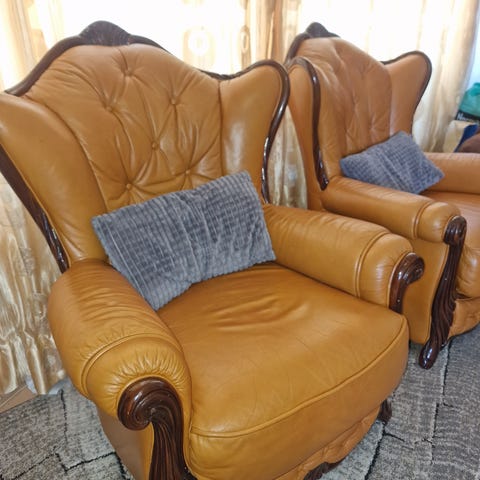 Sohva ja kaksi nojatuolia jalopuukäsinojilla ja -yläreunoilla. Todella kaunis ja laadukas kokonaisuus. Erinomainen istuttavuus. Nouto Laajasalosta. Sijaitsee ykköskerroksessa. Oven eteen voi parkkeerata, joten helppo siirtää.