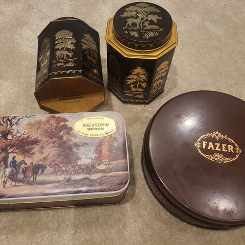 Kirkkaan punainen ruotsalainen alumiini säilytysrasiasarja on ikäisekseen OK käyttökunnossa. Osat ovat puhtaita ja käytön jälkiä iän mukaisesti. Yhdessä tölkissä on vähän isompi hapettuma ja sen seurauksena muutamia neulanpiston kokoisia reikiä pohjassa, kaikin puolin rasiat ovat kuitenkin käyttökelpoisia vielä. Keksipurkki kokonaisuuden mitat 22,5 x 22,5 x 26,5 cm. Nouto Itiksen vierestä tai postikulut L-pakettina ostajalle. Nopea postittaja. Yhdistän paketit pyynnöstä. Katso muutkin ilmoitukseni, runsaasti retroa, viljalti vintagea sekä muuton yhteydessä ylimääräiseksi osoittautunutta kivaa tavaraa myynnissä.