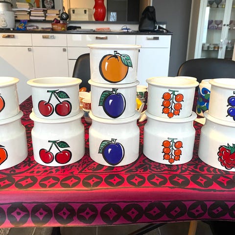 Kaksi kappaletta Ulla Procopén suunnittelemaa Tutti Frutti -purkkia mansikkakoristeella. Korkeus 6 cm, halkaisija 9,5 cm