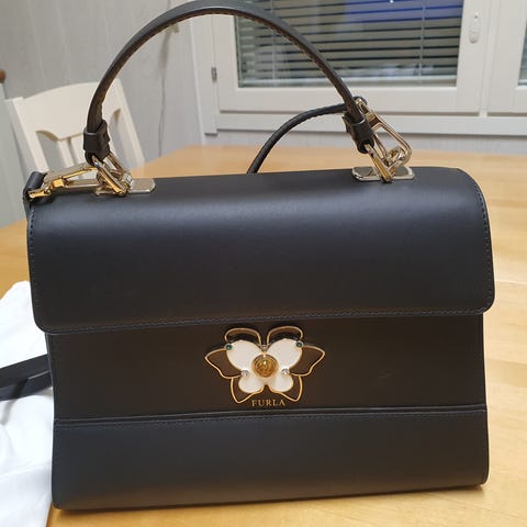 Kaunis aitonahkainen laadukas musta laukku, hennon vaaleanpunaisilla sisäyksityiskohdilla. Pidemmät kahvat, jotta saa istumaan olallekin hyvin, magneettikiinnittys, takapuolella sivutasku, sisällä sivutasku ja vetoketjullinen tasku. Vetoketjussa vielä suojatarra päällä. Edessä Furlan kullattu logo, laukun pohjassa tukinastat. Sivuilla napit, joilla laukun kokoa saa säädettyä. Ovh 455€, Furlan nettisivuilta loppuunmyyty. Dustbag tulee mukana.