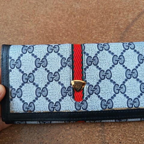 Gucci nahkalompakko unisex-käyttöön. Valmistettu nahkamateriaalista, jossa klassinen Gucci-kuosi ja kullanvärinen metallinen lukitus. Kolikkotasku napilla, kaksi setelitaskua ja 4 korttitaskua.