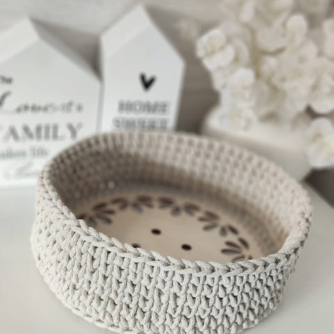 Virkatut korit vaneripohjalla. Pienemmän halkaisija 16cm ja korkeus 6cm. Isomman halkaisija 21cm ja korkeus 7cm. Lankana Bobbiny ja sävy Pearl.