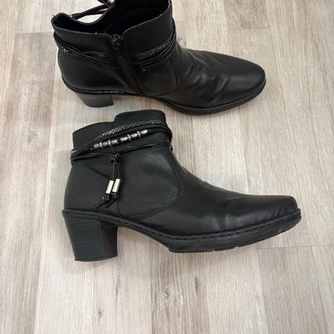 Riekerin mustat nahkaiset nilkkurit joissa ohut karvavuori ja koristeellinen nyöritys.