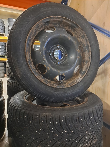 Renkaat Kumho WI32, 205/55R16, pintaa 7-8mm, tasaisesti kulunut.