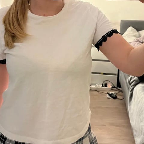 Kuvan kaunis pitsipaita. Kokolappua ei ole, arvioin koon olevan M-L