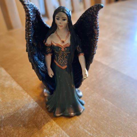 Keijukainen, jolla eläin sylissä. Hyvässä kunnossa.