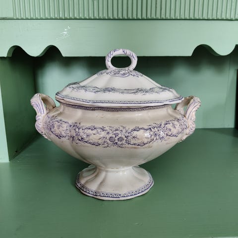 kauniisti muotoilu kannellinen tarjoilukulho esim. keitoille, joulupuurolle, vihanneslisäkkeille, muhennoksille..., koriste puna-kultaraita, kunto mint, h. 110,-