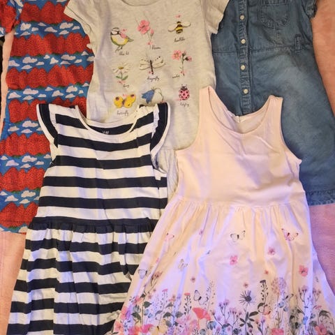 Myynnissä lastenvaatteita koossa 98-116 sekä naisten vaatteita koossa M-L, asusteita ja lasten kenkiä.