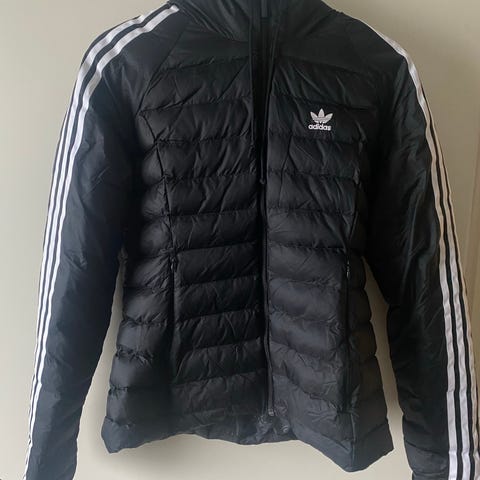 Pitkä Adidaksen bombertakki koossa xs. Voi mennä myös pienelle s-koolle. Tosi siistissä kunnossa, ainoastaan pientä nukkaantumista hihojen resoreissa.