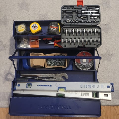 Metallinen työkalupakki harmaa väri. Käytetty kunto, näkyvää kulumaa ja leveys 40cm x 20cm korkeus 20cm.