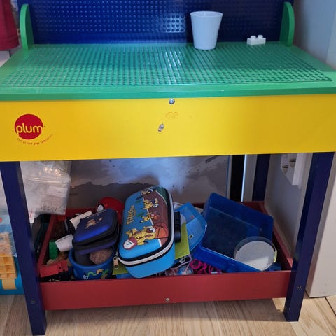 Lego pöytä ja kaksi liikkuvaa lelulaatikkoa