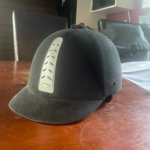 Ruskea HaloRider ratsastuskypärä koossa 55. Kypärässä on säädettävä hihna ja se on valmistettu kestävistä materiaaleista. Tarkoitettu ratsastukseen. Ei ole koskaan ollut kovassa pudotuksessa.