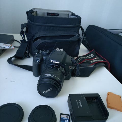 Myydään hyväkuntoinen Canon 550d järjestelmäkamera. Lisäksi 18-55mm IS kittilinssi uv suotimella (ollut aina paikallaan). Kamerassa paikallaan Meike mk-550dl akkukahva (tekniset tiedot löytyvät esim. https://www.amazon.com.au/Meike-MK-550DL-Professional-Vertical-Battery/dp/B00MMZMW84 ), jossa ohjelmoitava aika/sarjalaukaisin! Voi siis ohjelmoida ottamaan vaikka 500 time lapse kuvaa. Akkukahvaan on kaksi akkuadapteria, Yksi alkuperäisakuille ja yksi AA-akuille. Mukaan alkuperäinen akku, tarvikeakku joka näkyy kuvassa ei näköjään pidä enää virtaa. Lisäksi toki laturi ja 8Gb Sandisk Extreme muistikortti. Tällä kameralla voi myös kuvata erittäin hyvätasoista videoa.