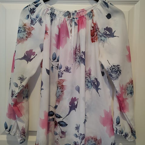 Hauska turkoosi-vaaleanlila-valkoinen pliseerattu paita, levenevät hihansuut. Venekaulusaukko. Joustavaa materiaalia.