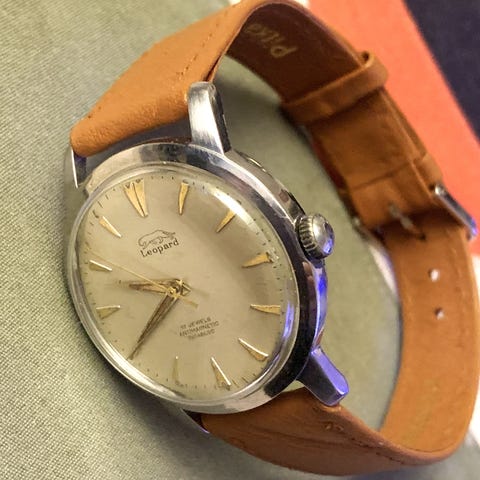 Siisti toimiva mekaaninen Leopard Super Vintage rannekello. Kone käy terveellä käynnillä.Keräilijän jäämistöstä puhdas yksilö. 2023 vaihdettu vetonuppi.Huom! Koko nupinpäähän noin 34mm. Katso kuvat ja muutkin myyntini Torissa.Valmistusmaa Sveitsi. Kunto kuvan mukainen. Ranneke noin 18-19cm ranteeseen.