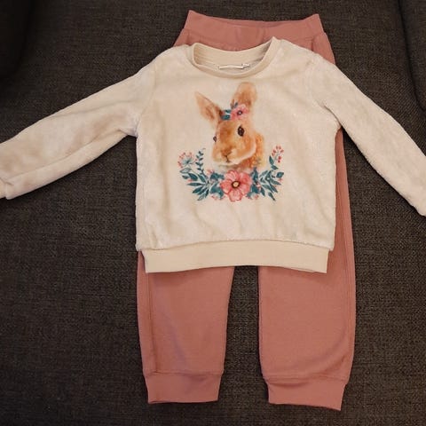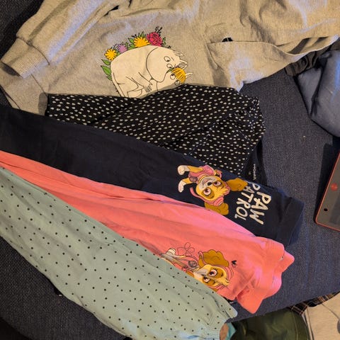 Ihanat, villakoirakuvioiset Pop&Co-merkin leggarit ja paita. Yhdellä lapsella olleet käytössä, siistit ja ehyet. Koko 98.