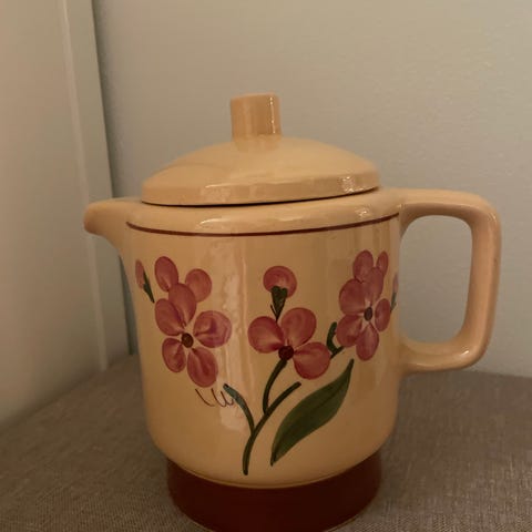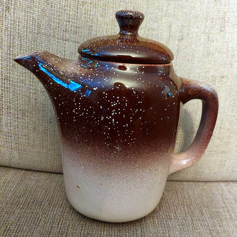 Keraaminen tepannu. Muutamassa kohtaa kuvissa näkyy, että on ottanut vähän osumaa, mutta toimii ja on muuten hyvä kuntoinen. Otaksun, että teepannu on raku keramiikkaa lasitteessa näkyvän särkymiskuvion perusteella.
