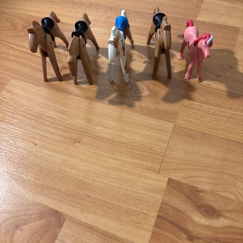 Myydään Playmobil setti, joka näkyy kuvassa. Hevosia 6 kpl ja ratsastajia tarvikkeineen, pesupaikka, pilttuu, palkintojenjakokoroke yms. Alkuperäisistä seteistä puuttuu osia. Sopii hyvin Schleich- hevosten kanssa yhteisleikkiin.