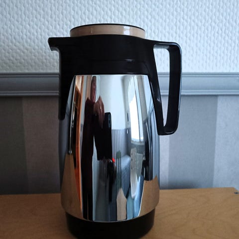 Kunnossa oleva termokahvinkeitin. Keittää kuuman kahvin. Vetoisuus 10 kuppia.