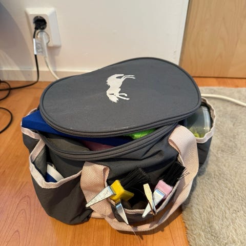 Keppihevosleikeissä käytetty harjapakki kuvan mukaisine harjoineen, sukineen, kampoineen ym.
