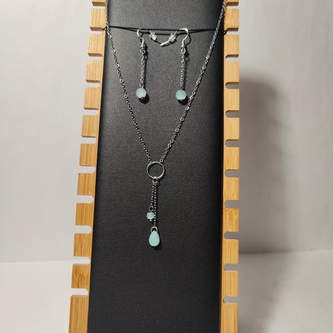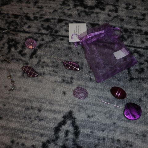 Käyttömätön korusetti violeteilla lasihelmillä.