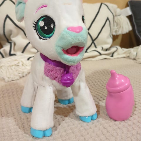 Myydään interaktiivinen Club petz Milky-vuohi,joka toimii paristoilla ja ääntelee. Kun juotat sille tuttipulloa se pääsee jaloilleen.