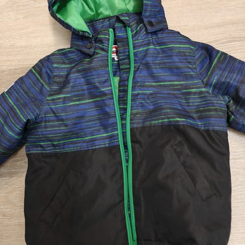 Ruskea 92 cm vedenpitävä takki heijastimilla. Kevyt beige 98 cm tuulitakki. Beige 98 cm housut vahvistetuilla polvilla ja kahdella takataskulla. Mustat 92 cm farkut. Lämpimät 104 cm talvihousut.