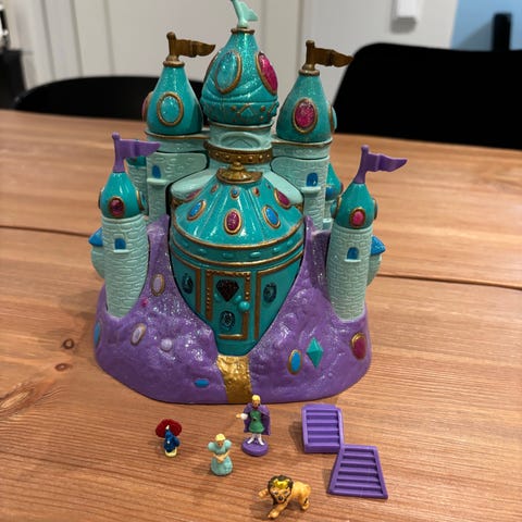 90-luvun Trendmasters Starcastle in the clouds linna, kunto oikein hyvä. Linnasta en löydä puutteita. Tavaroista ainakin pienen pieni rusetti siivistä puuttuu.