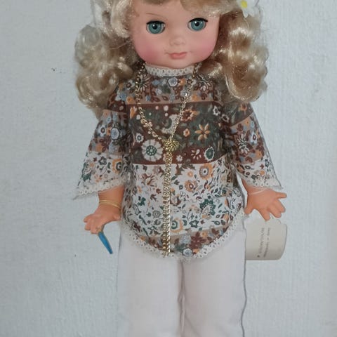 Todella siistikuntoinen nukke 1980-luvulta. Koko 19x39cm. Vaatteet puhtaat ja koko nukke siisti. Vain toinen letin naru puuttuu. Nukella on selässä patterikotelo, jossa on äänilevy, joka ei toimi, vaikka levy pyörii laittaessa patteri sisään. Nuken navan kohdalla on äänipainike.