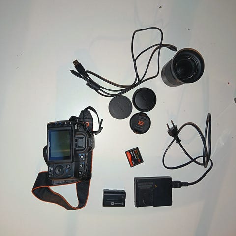 Mieluummin kaikki yhdessä, mutta voidaan myydä myös runko, objektiivi, akku, laturi,