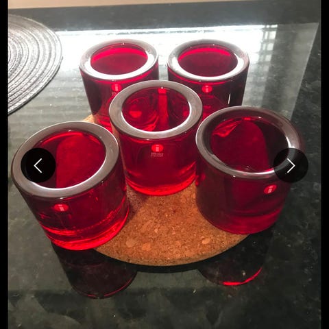 Tuikut, väri pomeranssi. Yksi tuikku viallinen, puuttuu pari pientä palaa reunasta ja pohjassa pieni viiru. Pieniä naarmuja ajan saatossa tullut mutta ehjiä ovat.. Hinta näille neljälle 50e.