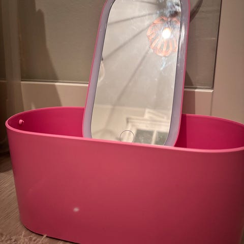 Pyöreä pöytätasopeili, jossa on kaksipuoleinen peili. Peilissä on pinkki kehys ja se on säädettävä kallistuksen suhteen. Käytettävissä esimerkiksi meikkaamiseen tai henkilökohtaiseen hoitoon. Аlhaalta voidaan painaa napista ja tulee lisäksi vähän valoa.