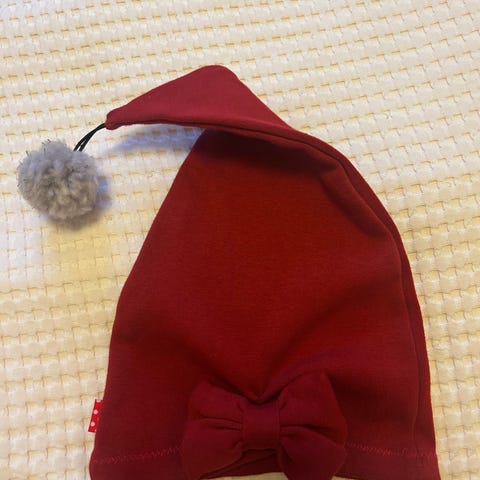 Hyväkuntoinen yhtenä jouluna käytetty tottulakki. Iso rusetti ja valkoinen tupsu. Ompelijan ompelema. Meidän pikkusiskolle juuri nyt mahtuisi mutta alkaa olemaan vähän nafti, hänen py 46,5cm, joten sopiva tätä pienemmälle/max 46,5cm.