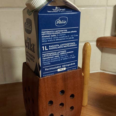 Puinen, kotimainen litran maitotölkin/mehutölkin kaadin/pidike, jolla esim lasten helpompi kaataa neste lasiin, kun pahvitölkkien pahvi koko ajan vain ohenee ja tölkin pitäminen ja siitä kaataminen tullut hankalammaksi verrattuna entisiin paksumpiin pahvitölkkeihin. Teline todellista retroa, muistoa 70luvulta.