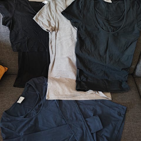 Myyntiin 5kpl imetyspaitoja ja 3kpl imetystunikoita. Käytetty kunto, muutamassa paidassa/tunikassa kangas nyppyyntynyt tai pesussa lähtemätön tahra. Kaikki muut kokoa M, paitsi raitatunika kokoa L. Paketissa mukana myös yksi L-koon musta imetys t-paita, joka ei ole kuvassa mukana.