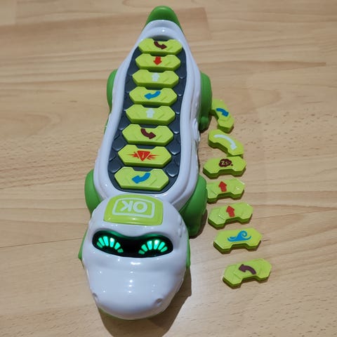 Hauska krokotiili tutustuttaa lapsen leikin ohella ohjelmoinnin maailmaan. Laita palikat paikalleen krokotiilin selkään ja krokotiili liikkuu ja toimii palikoiden mukaisesti.