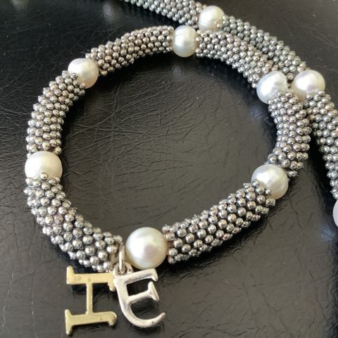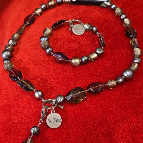Saffire Helmipolku korusetti joka koostuu kaulakorusta (n. 89 cm) ja joustavasta rannekorusta. Kaulakorussa papukaijalukko. Hienossa kunnossa.