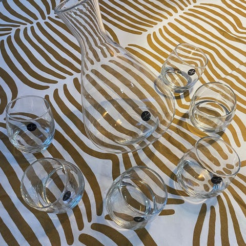 Huippukuntoinen setti. Karahvin korkeus 26cm ja lasien 13cm.