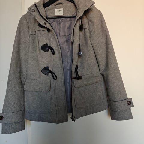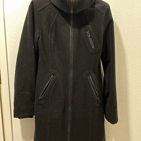Hyväkuntoinen, vähän käytetty Vero Moda villakangastakki. Ei vuorta. Koko L. Vetoketju ja nappikiinnitys. Tekonahkapinnoitetty vyö. Toisen taskun pinnoituksessa pieni halkeama. Nouto Tampere 33100.