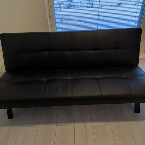 Sotka sohva, sininen kangaspäällyste, kuvioitu kukkakuosi. Sopii olohuoneeseen tai muuhun oleskelutilaan. Aurinko haalistanut käsinojaa hieman