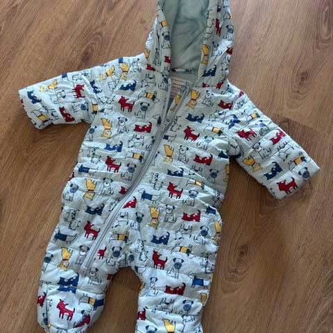 Haalari on erinomaisessa kunnossa. Erittäin pehmeä ja lämmin, syvällä hupulla ja tiiviisti peitetyllä kaula-aukolla. Koko 62. Pituus hupun kanssa 74 cm, ilman huppua 56 cm, leveys 31 cm