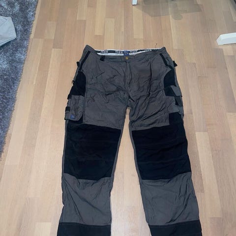 Dimexin mustat ulkoiluhousut kokoa 58. Valkoinen tahra on vedellä puhdistettavissa ennen toimitusta.