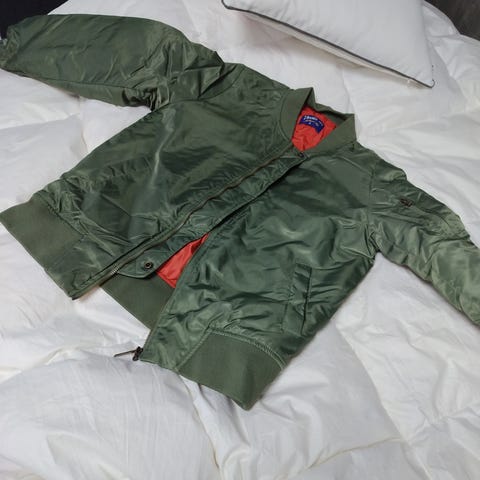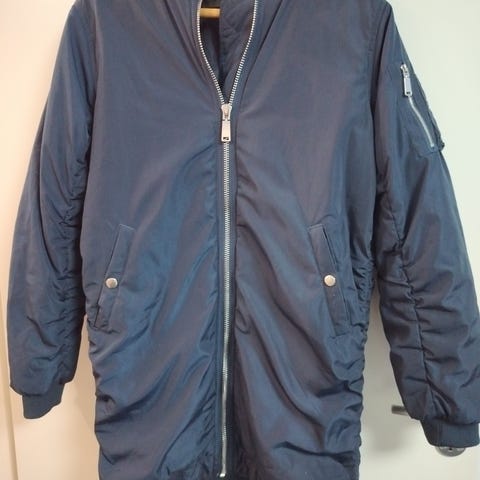 Muutaman kerran käytetty kuoritakki, pientä mitoitusta. Hieman tummentumaa päällykankaassa. Ei vuorta. Hihan pituus kainalosta 45cm, pituus olalta helmaan 60cm, selän leveys kainaloiden kohdalta 43cm. Koko sopii noin 150-160cm pitkälle :)