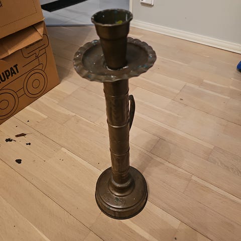 Upea iso metallinen (painava) kynttilänjalka. Korkeus ilman kynttilöitä 55 cm. Mieluiten haku. Jos lähetän, hintaan lisätään postikulut.