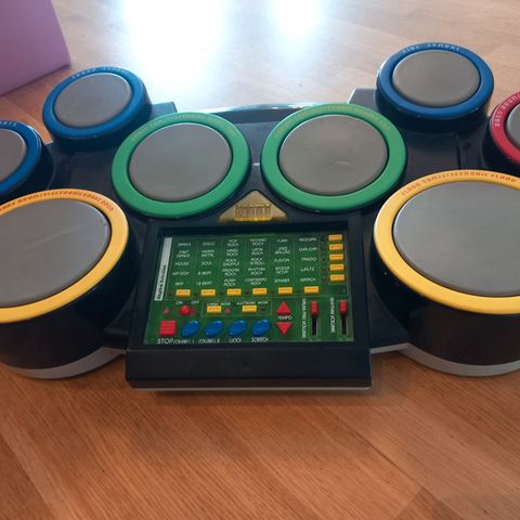 Lelu rumpusetti, mukana kapulat. Soitin soittaa musiikkia ja tempoa. Toimii paristoilla.