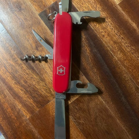 Hyväkuntoinen vasemman käden aito Swiss Army Knife. Saksista puuttuu toinen terä.