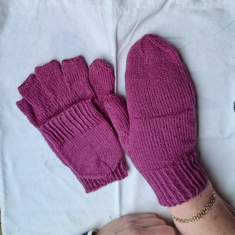 Neulotut läpälliset kynsikkäät, jossa lankana on merino gold (merino 50%, akryyli 50%), joka on pehmeä, lämmin ja kestävä