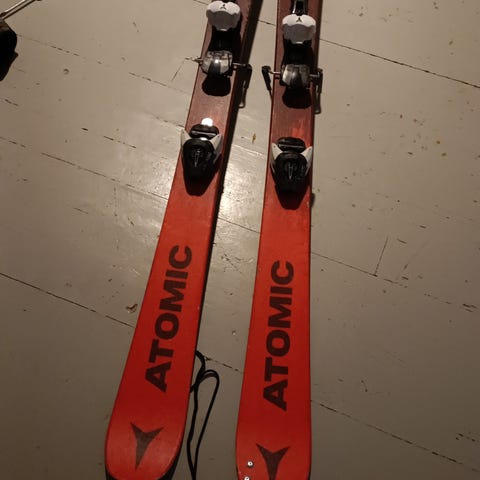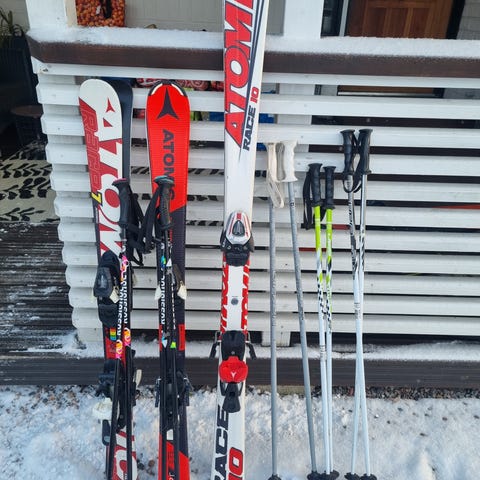 Atomic Race GS / 160cm ja sauvat 120cm. Muuten näyttää hyvältä, mutta pohjissa on naarmut.