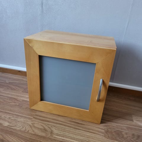 Lasi ovella, kahdella laatikolla oleva kaappi. Kaluste pyörät alla. Laatikoissa on avain